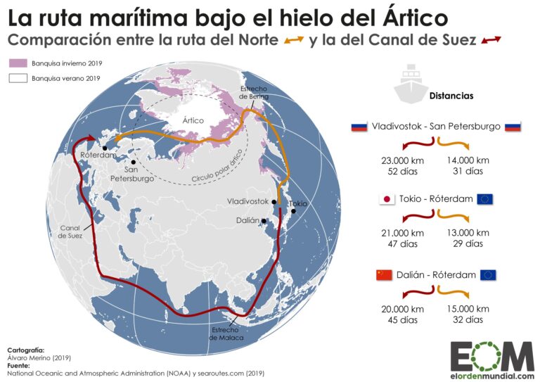 Este mapa, creado por Álvaro Merino para la web El Órden Mundial, muestra las dos grandes rutas marítimas para navegar desde el Mar de Japón hasta el principal puerto de Europa, Róterdam.