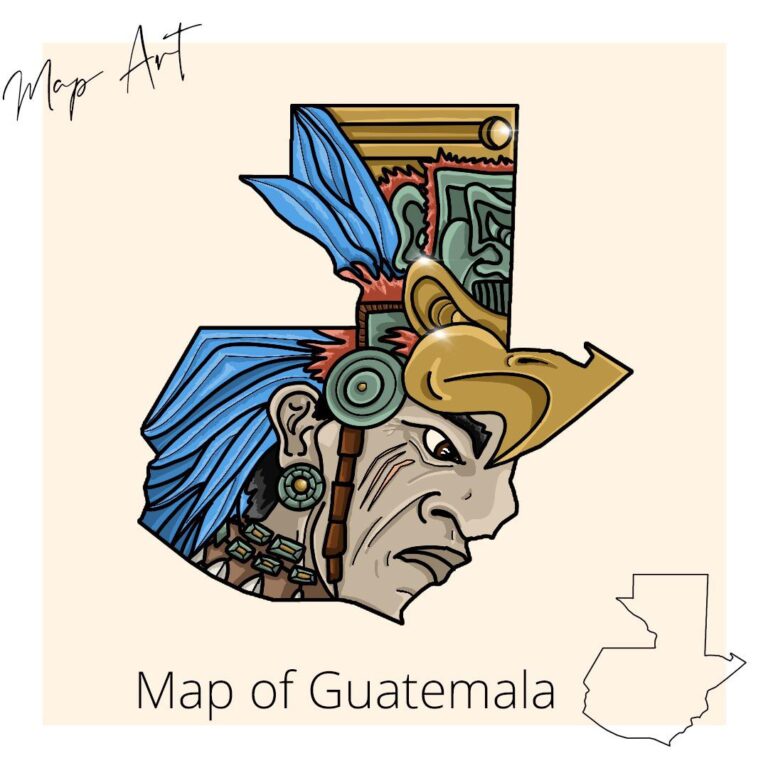 Este mapa, creado por Max Schörm en 2021, muestra el contorno de Guatemala con un relleno artístico que representa a un guerrero maya.