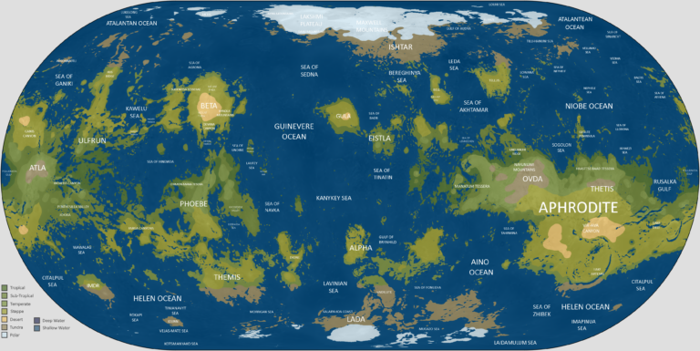 En este trabajo de ficción, se supone que Venus sería inundado con volumen de agua proporcional al existente en la Tierra, y que su climatología cambiaría para asemejarse a la terrestre. En azul aparecen representados los mares, con un color más intenso en las regiones más profundas. En el resto de colores se muestra la tierra firme con los climas indicados en la leyenda.