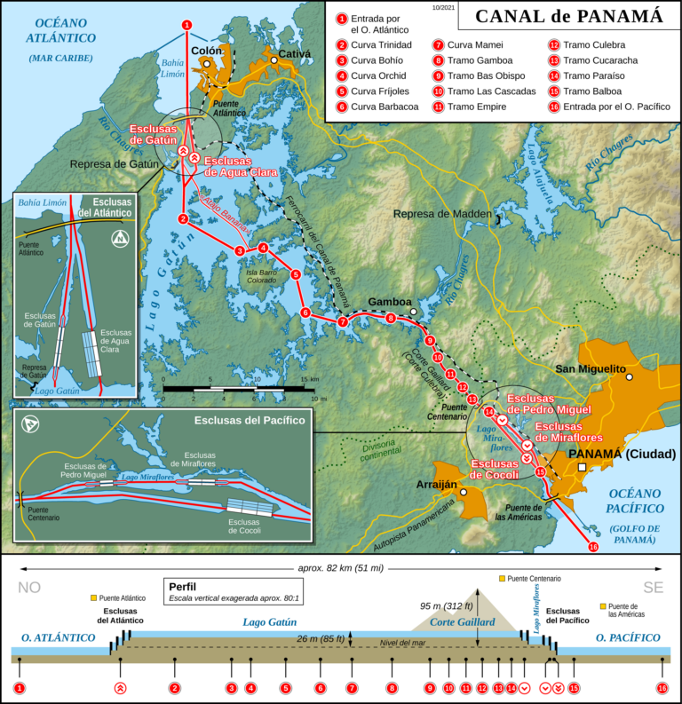 Este mapa, creado por Thoroe para Wikimedia Commons, representa a todo detalle la complejidad del Canal de Panamá. El mapa fue originalmente creado en alemán en el año 2012, y traducido un año más tarde al español por el mismo autor.