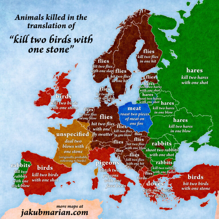Este mapa, creado por el ilustrador Jakub Marian en 2017, muestra la diferentes formas de la expresión «matar dos pájaros de un tiro» en las distintas lenguas de Europa.