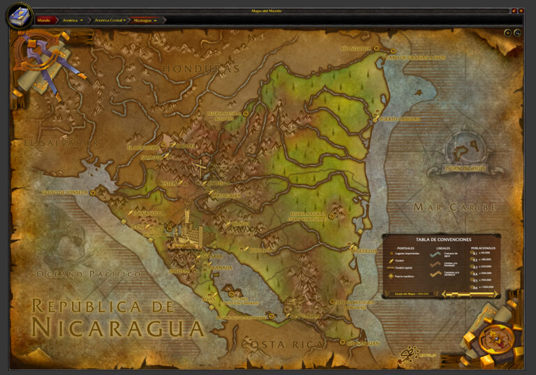 Este mapa, creado por Santiago Reyes en 2024, representa Nicaragua. La ilustración forma parte del proyecto para representar toda Latinoamérica en el estilo del World of Warcraft.