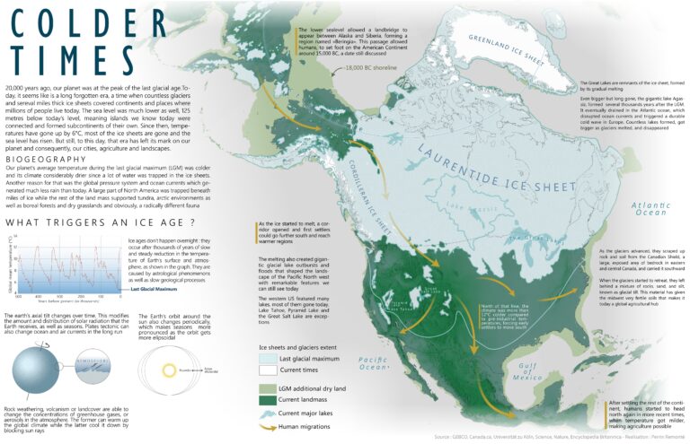 Los colores utilizados ayudan a establecer la comparativa entre la extensión de la tierra y el hielo durante el máximo glaciar comparado con la actualidad. En verde claro y en azul claro se muestra la extensión de las tierras y del hielo, respectivamente, durante el pico glaciar. En verde oscuro y blanco, la extensión de las tierras y del hielo en la actualidad.