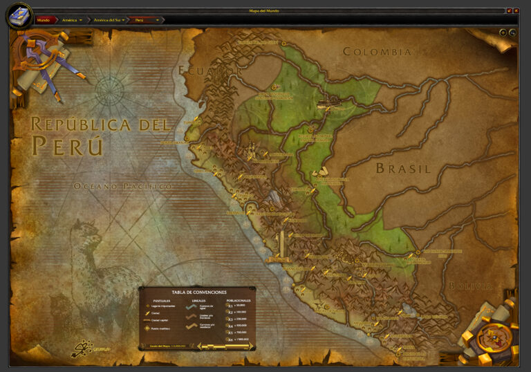 Este mapa, creado por Santiago Reyes en 2024, representa Perú. La ilustración forma parte del proyecto para representar toda Latinoamérica en el estilo del World of Warcraft.