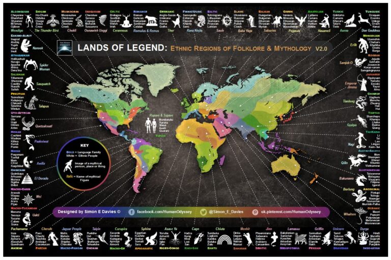 Este mapa, creado por Simon E. Davies, muestra y agrupa el folclore y mitología de distintas regiones del mundo.