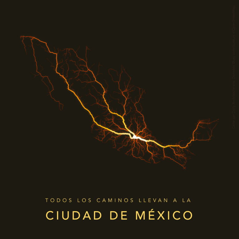 El mapa muestra todos los caminos desde las 2477 ciudades de México hasta la capital, Ciudad de México, siguiendo siempre el camino más corto. El color de las carreteras pasa de rojo claro a amarillo claro en función de la cantidad de trayectos, desde cada ciudad, que pase por cada una de las carreteras.