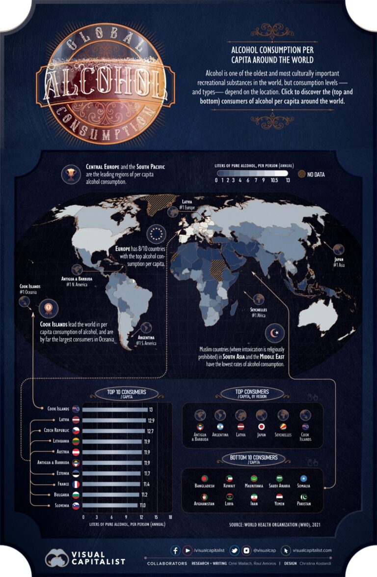 Este mapa, creado por Christina Kostandi para Visual Capitalist en 2021, muestra el consumo per cápita de alcohol en el mundo.