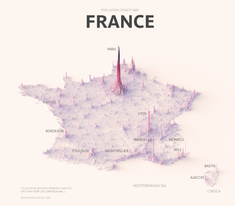Esta ilustración, realizada por Terence Teo, representa la densidad de población de Francia en un mapa de tres dimensiones. Para ello, Terence ha extraído los datos disponibles en Kontur Population con los que genera mediante un programa columnas con una altura que representa la densidad de población en cada punto.