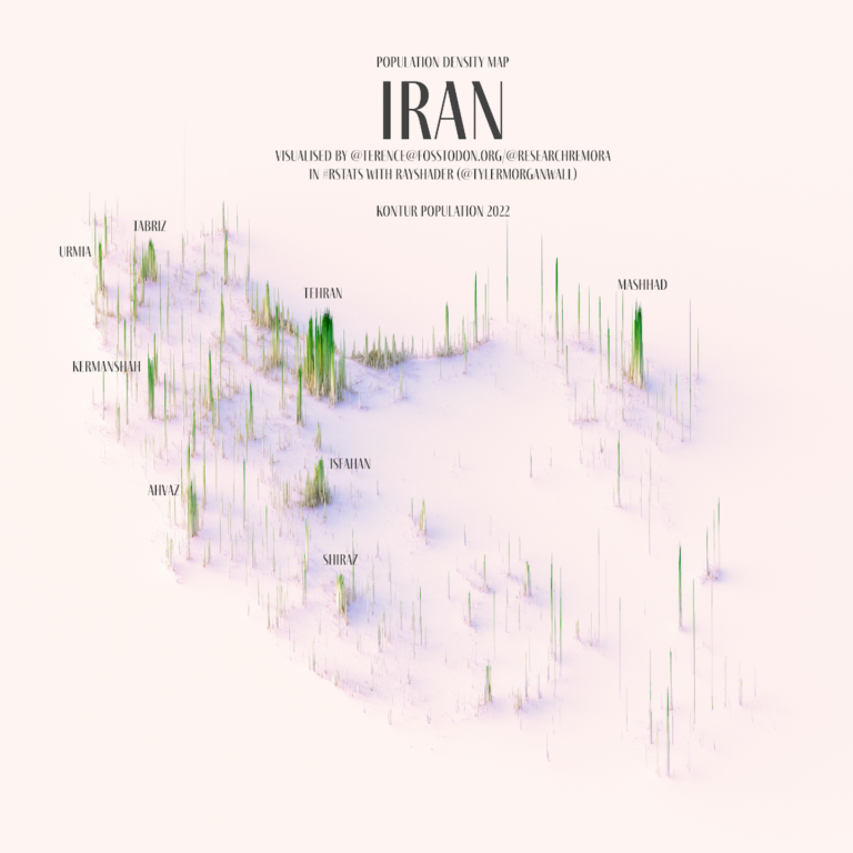 Esta ilustración, realizada por Terence Teo, representa la densidad de población de Irán en un mapa de tres dimensiones. Para ello, Terence ha extraído los datos disponibles en Kontur Population con los que genera mediante un programa columnas con una altura que representa la densidad de población en cada punto.