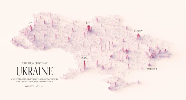 Este ilustración, realizada por Terence Teo, representa la densidad de población de Ucrania en un mapa de tres dimensiones. Para ello, Terence ha extraído los datos disponibles en Kontur Population con los que genera mediante un programa columnas con una altura que representa la densidad de población en cada punto.