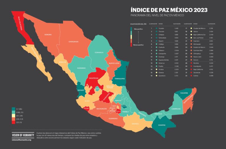 Este mapa, publicado por el Instituto para la Economía y la Paz (IEP), forma parte del informe del Índice de Paz México 2023, en el cual se analiza el desarrollo de la violencia y la paz en el país. El informe utiliza datos del año 2022.