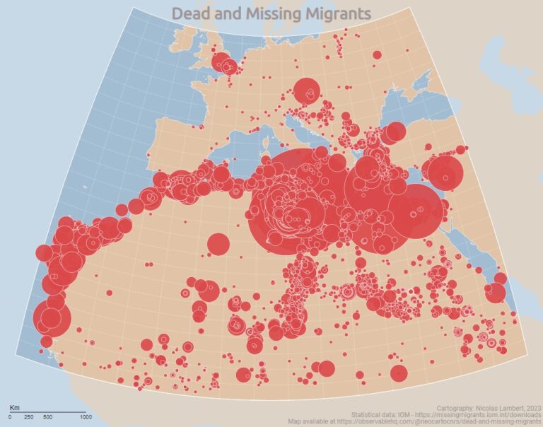 Para su elaboración, el autor ha utilizado los datos facilitados por Missing Migrants Project entre los años 2014 y 2023. El número total de migrantes que han perdido la vida o desaparecido en este periodo en el mundo asciende al escalofriante número de 56.017.