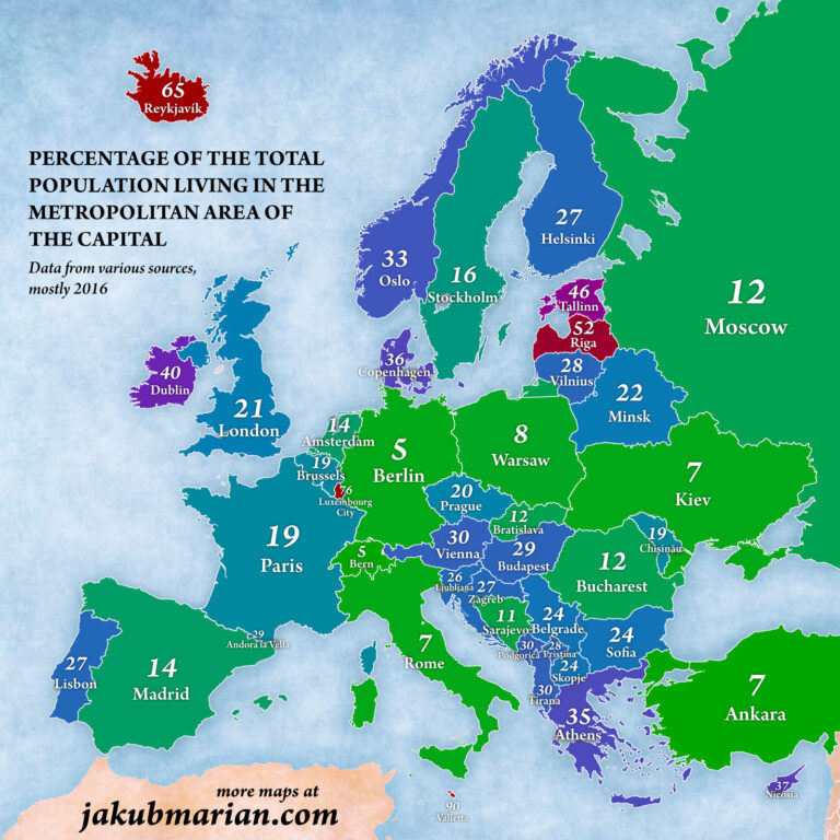 Este mapa, creado por el ilustrador Jakub Marian, muestra el porcentaje de habitantes de cada país que viven en el área metropolitana de la capital, con datos de 2016.