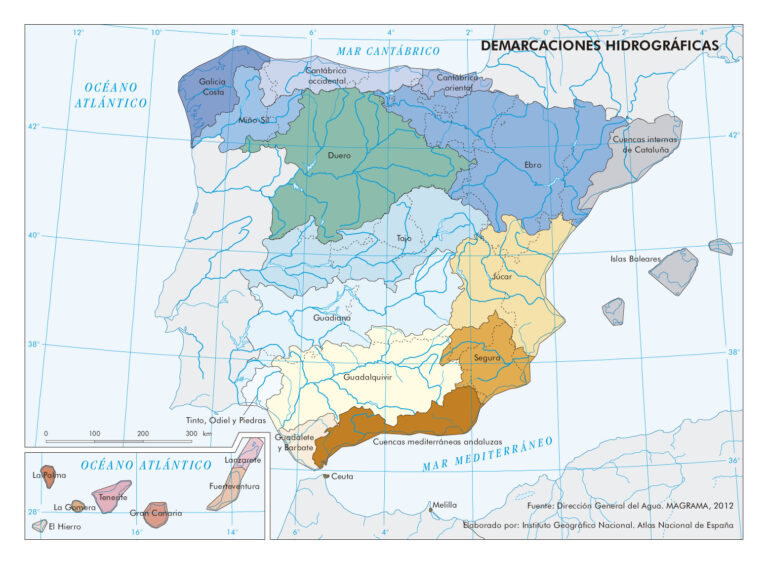 España reconoce un total de 26 demarcaciones hidrográficas, todas ellas representadas en el mapa:
