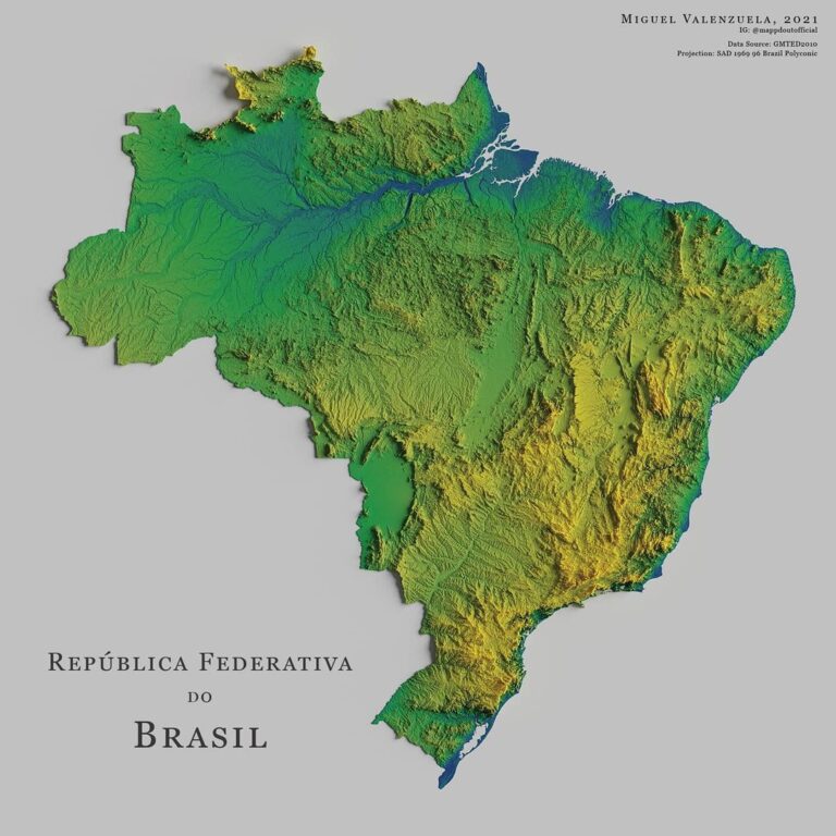 Este mapa, creado por Miguel Valenzuela, muestra el relieve de Brasil. Para ello utiliza tres colores: azul para las zonas bajas, verde para las zonas medias y amarillo para las zonas altas, simulando la bandera del país. Además el autor utiliza sombreado, lo que hace que se resalten las zonas abruptas.