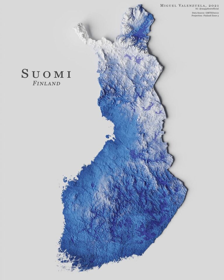 Este mapa, creado por Miguel Valenzuela, muestra el relieve de Finlandia. Para ello utiliza dos colores: azul para las zonas bajas y blanco para las altas cumbres, simulando los colores de la bandera del país. Además, el autor emplea sombreado, lo que hace que se resalten las zonas abruptas.
