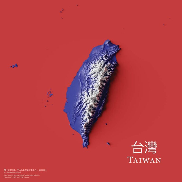 Este mapa, creado por Miguel Valenzuela, muestra el relieve de Taiwán. Para ello, utiliza dos colores: azul para las zonas bajas y blanco para las altas cumbres. Junto con el fondo rojo, consigue simular los colores de la bandera del país. Además, el autor emplea sombreado, lo que hace que se resalten las zonas abruptas.