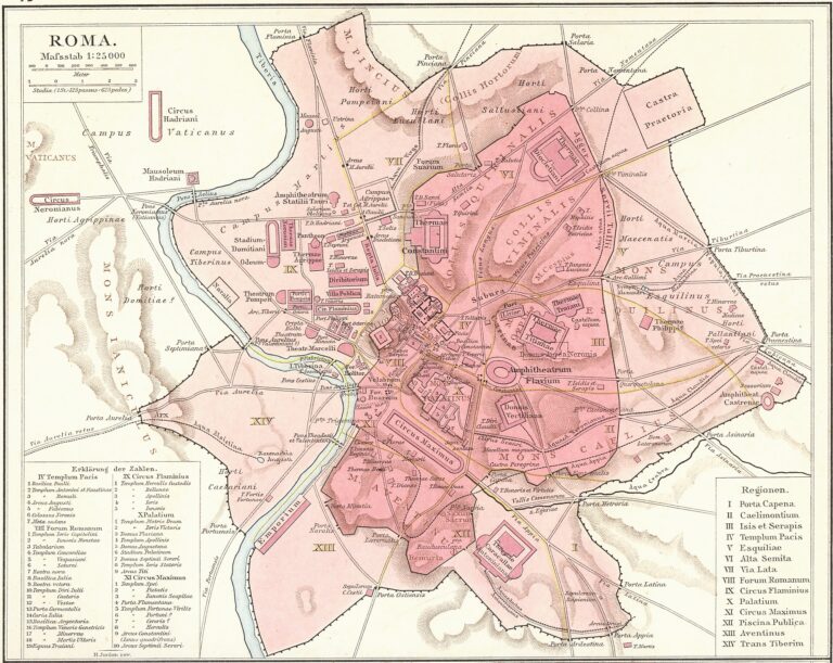 Este mapa de Roma en la Antigüedad, creado bajo la dirección del geógrafo alemán Richard Andree, aparece dentro del atlas histórico publicado por el historiador alemán Gustav Droysen con el nombre Allgemeiner Historischer Handatlas en 1886.
