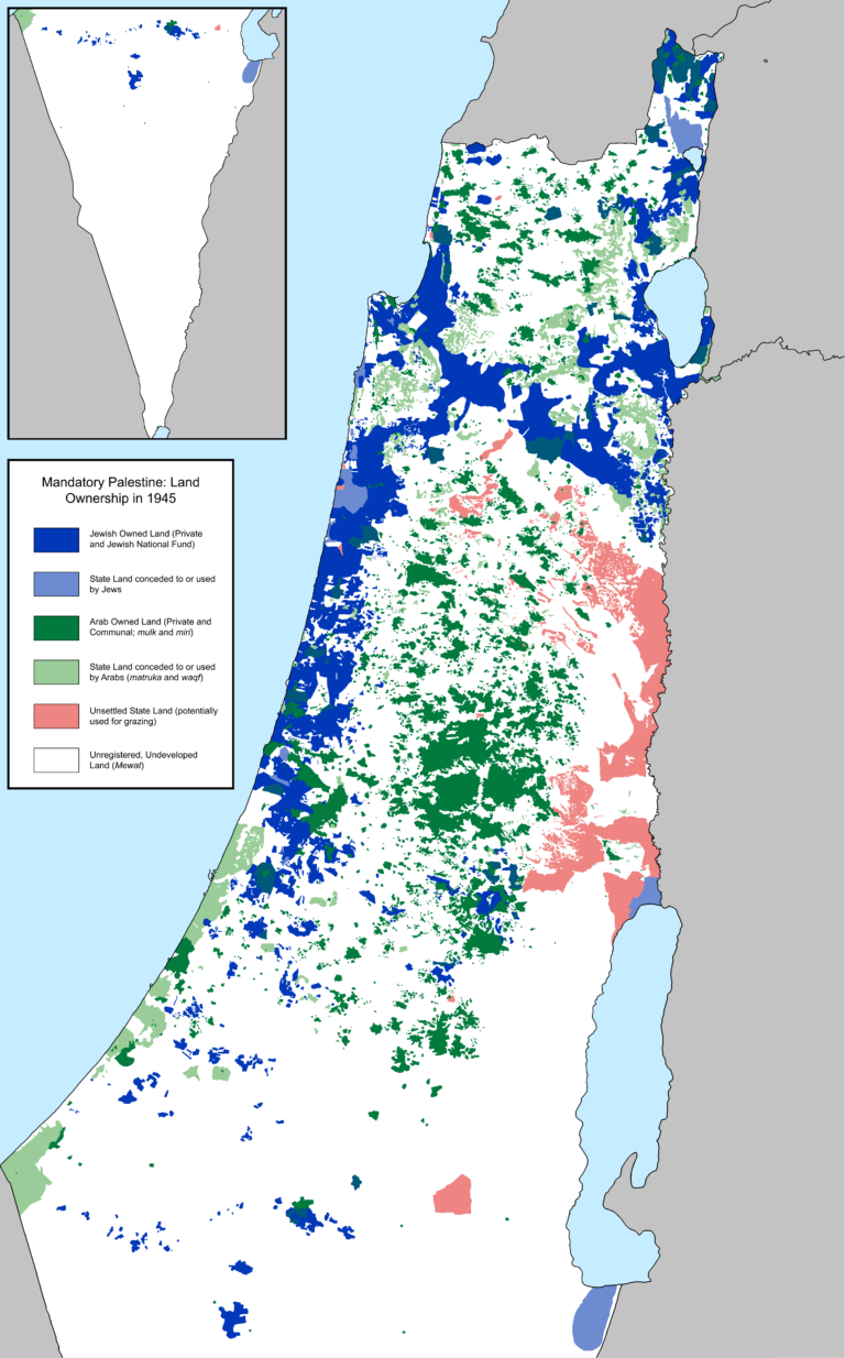 Como resultado, al final de la Segunda Guerra Mundial, la propiedad de la tierra mostraba una gran división entre judíos y palestinos, tal y como muestra el mapa: