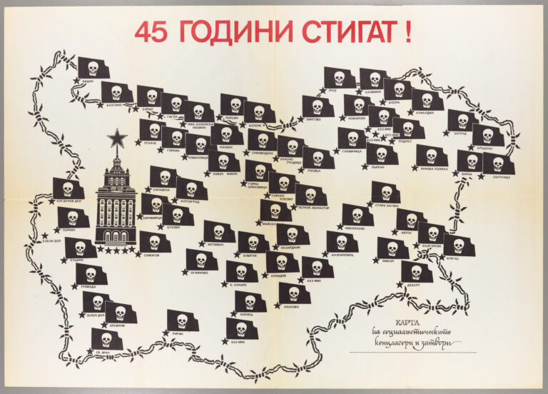 En el mapa, Tomov muestra todos los campos de concentración y prisiones existentes donde estaban encerrados los disidentes de la República Popular de Bulgaria. En rojo, en la parte superior, se puede leer ¡45 años son suficientes!, en referencia a los 45 años que transcurrieron entre la liberación de Bulgaria por parte de la Unión Soviética y el fin del régimen comunista.