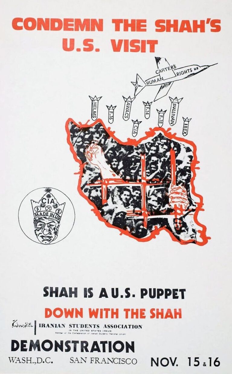 Este póster fue publicado por la Asociación de Estudiantes Iraníes en Estados Unidos (ISAUS) en noviembre de 1977, para anunciar las manifestaciones contra la visita del Sah Mohammad Reza Pahleví a los Estados Unidos.