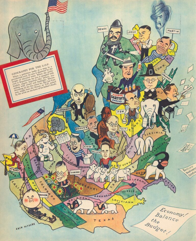 Este mapa fue creado por Erik Nitsche para la revista Fortune y publicado en 1939. La ilustración, con una importante carga propagandística, lleva el título de Geografía para el GOP (Great Old Party, en referencia al Partido Republicano).