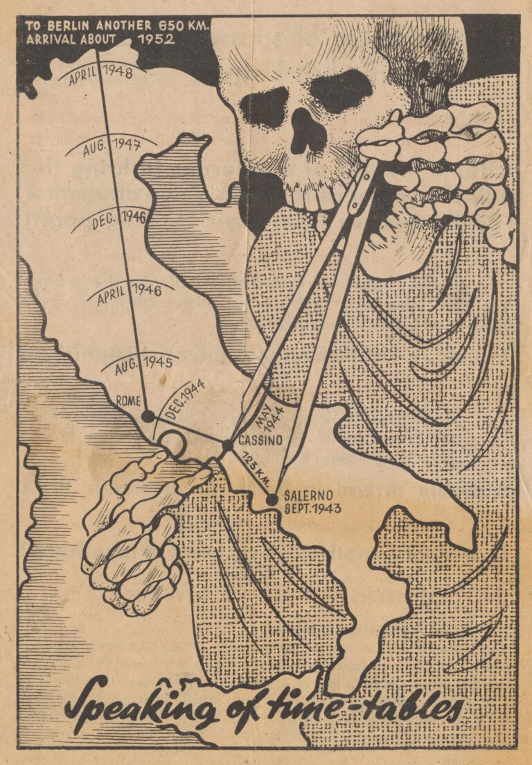 Este panfleto propagandístico cuestiona el lento avance que estaba teniendo la ofensiva del sur. Tal y como describe el mapa, en ocho meses apenas habían conseguido avanzar 123 kilómetros. Extrapolando esa velocidad, con los cálculos que realiza el esqueleto, las tropas aliadas no llegarían a Berlín hasta 1952.