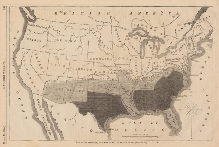 Este mapa, de corte propagandístico, fue publicado por el periódico neoyorquino Harper’s Weekly el 19 de marzo de 1864 con el título completo “Map of de rebellion, as it was in 1861 and as it is in 1864” (Mapa de la rebelión, cómo era en 1861 y cómo es en 1864).