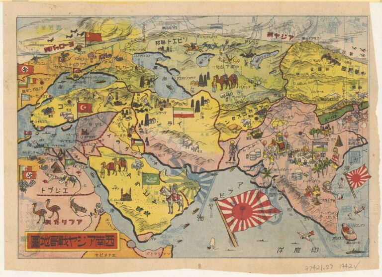 Este mapa, publicado por la editorial japonesa Nobarasha (野ばら社) en 1942, muestra Oriente Medio a mediados de la Segunda Guerra Mundial. Actualmente, esta copia se conserva en la Biblioteca Nacional de Australia.
