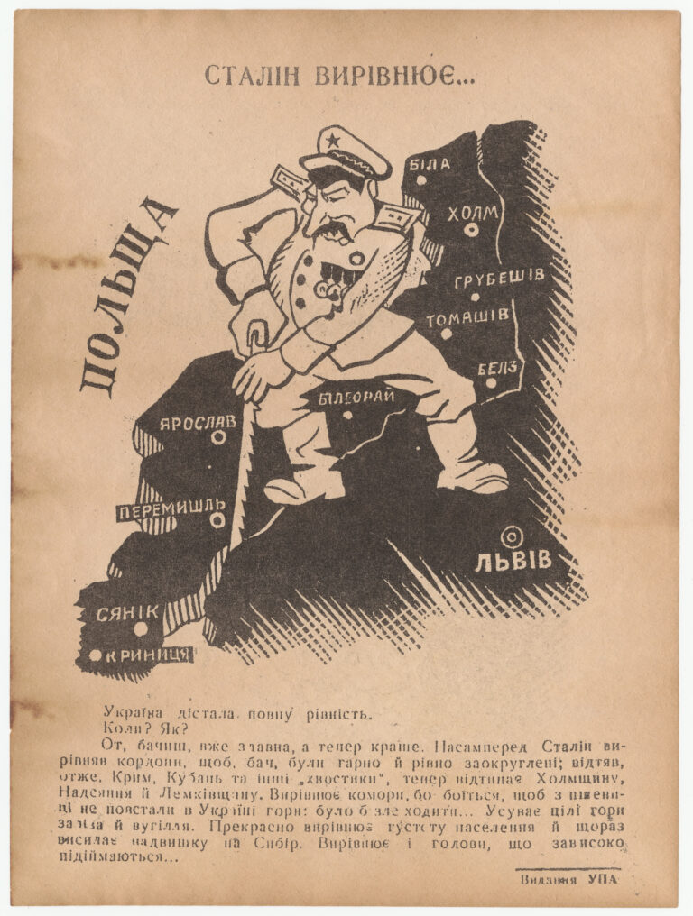 Este mapa, publicado en forma de panfleto a finales de 1945 por el Ejército Insurgente Ucraniano, representa a Joseph Stalin trazando con una sierra la nueva frontera que separaría a Ucrania y Polonia.