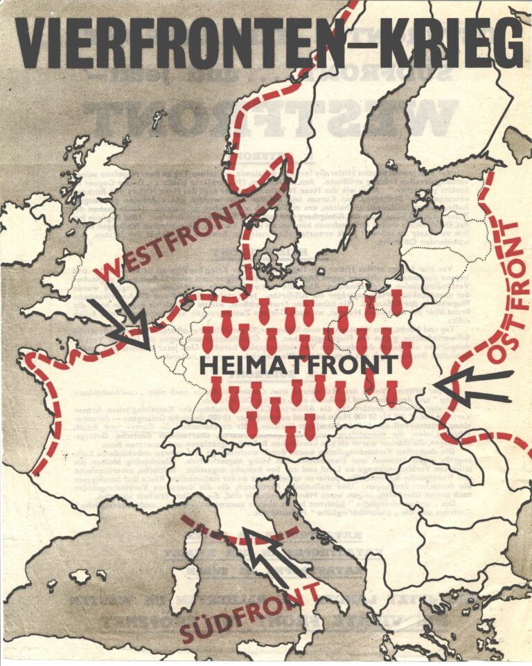 Se trata de un mapa propagandístico que estaba dirigido para los soldados del ejército alemán que se encontraban en el frente. En él aparece la situación de las las fuerzas del Eje en 1944, con su territorio delimitado por una línea punteada en rojo. Con tres flechas negras se muestra el avance de Estados Unidos y el Reino Unido desde el sur de Italia, el avance de la Unión Soviética desde el este y, a partir de ese día, el avance de las tropas aliadas desde las costas de Normandía.