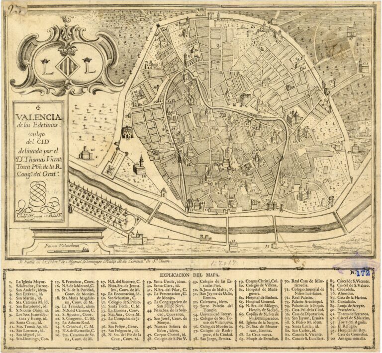 Este mapa de la ciudad de la Valencia fue dibujado por Tomás Vicente Tosca en 1704, el cual se conserva en el Museo Histórico Municipal de Valencia. Este plano fue más tarde modificado por Antonio Bordazar y grabado para su publicación en 1738. El plano está orientado con el norte en la parte inferior.
