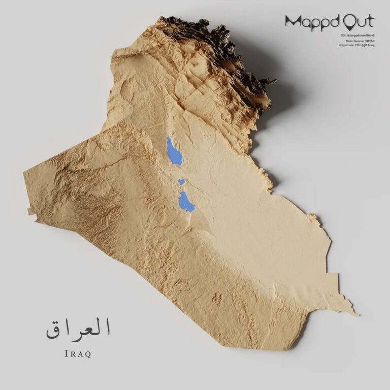 Este mapa, creado por Miguel Valenzuela, muestra el relieve de Irak. Para ello, utiliza tres colores: azul para las zonas por…
